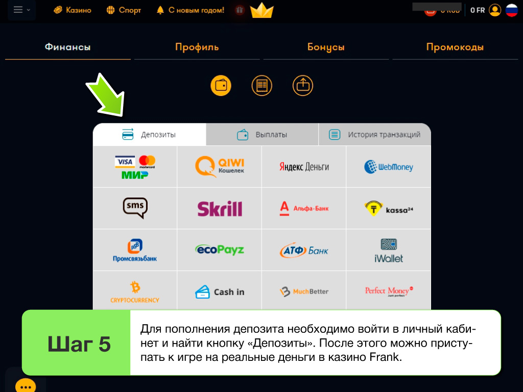 Играть с бонусомПосле регистрации гость Frank казино сможет входить в свой личный кабинет на официальном сайте или через актуальные зеркала 2025, и в нем: