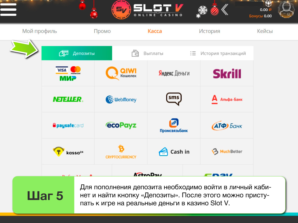 Для пополнения депозита в казино Слот V действует минимальный лимит 5USD. При выплате выигрышей игрок не сможет перечислить с депозитного счета менее чем 10USD. Расчетные операции можно свободно осуществлять с официального сайта, либо с рабочих интернет зеркал клуба.